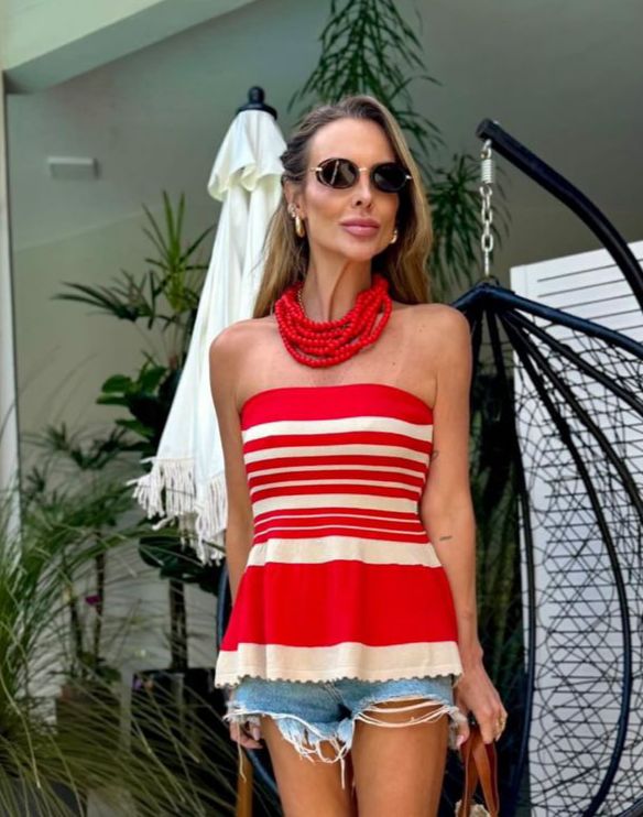 O tricot listrado em tons vibrantes garante um visual fresh, moderno e cheio de estilo — perfeita para combinar com shorts, saias ou calças em produções casuais e elegantes.