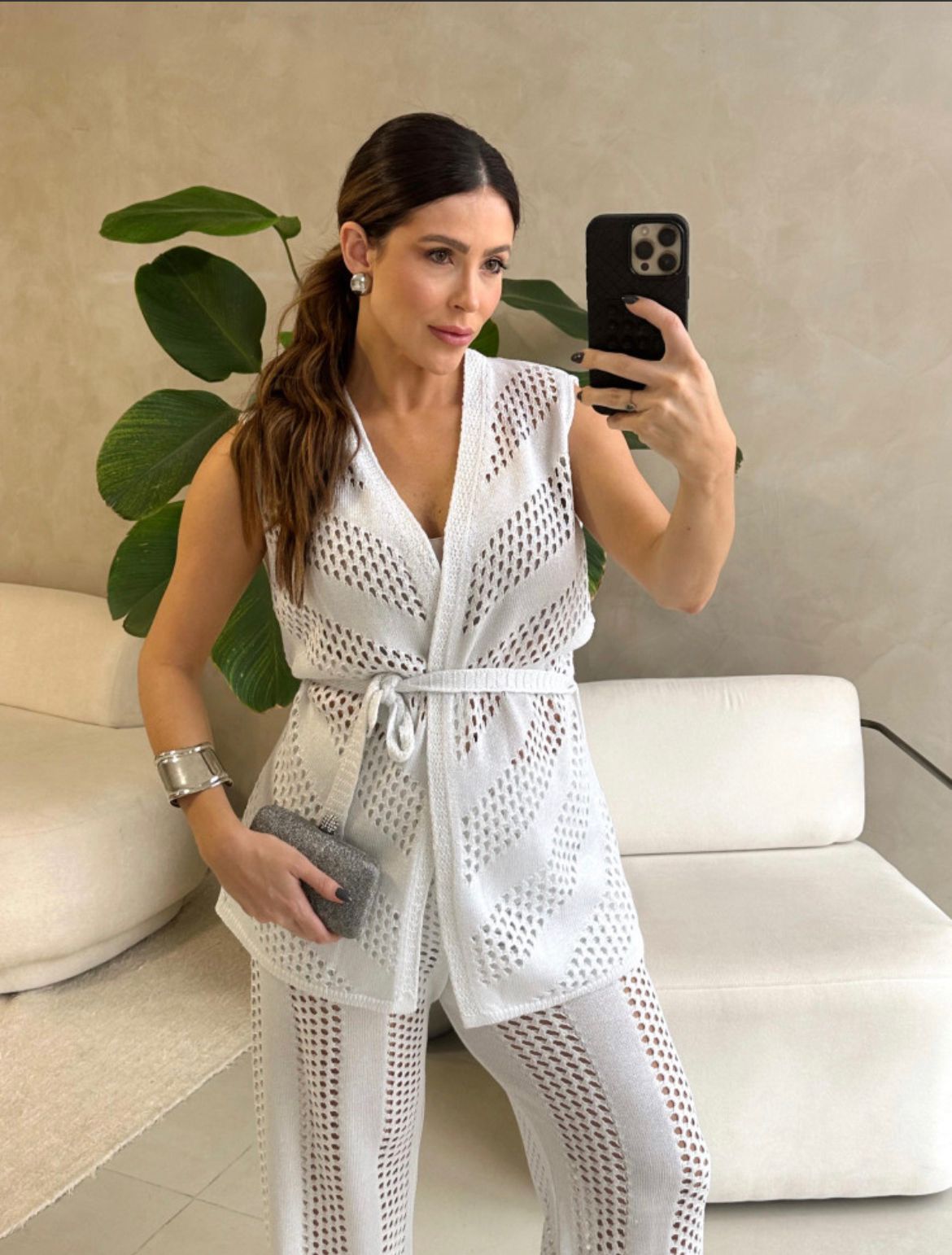 A calça de caimento reto alonga a silhueta e o colete com amarração na cintura destaca a feminilidade de forma sutil e sofisticada.