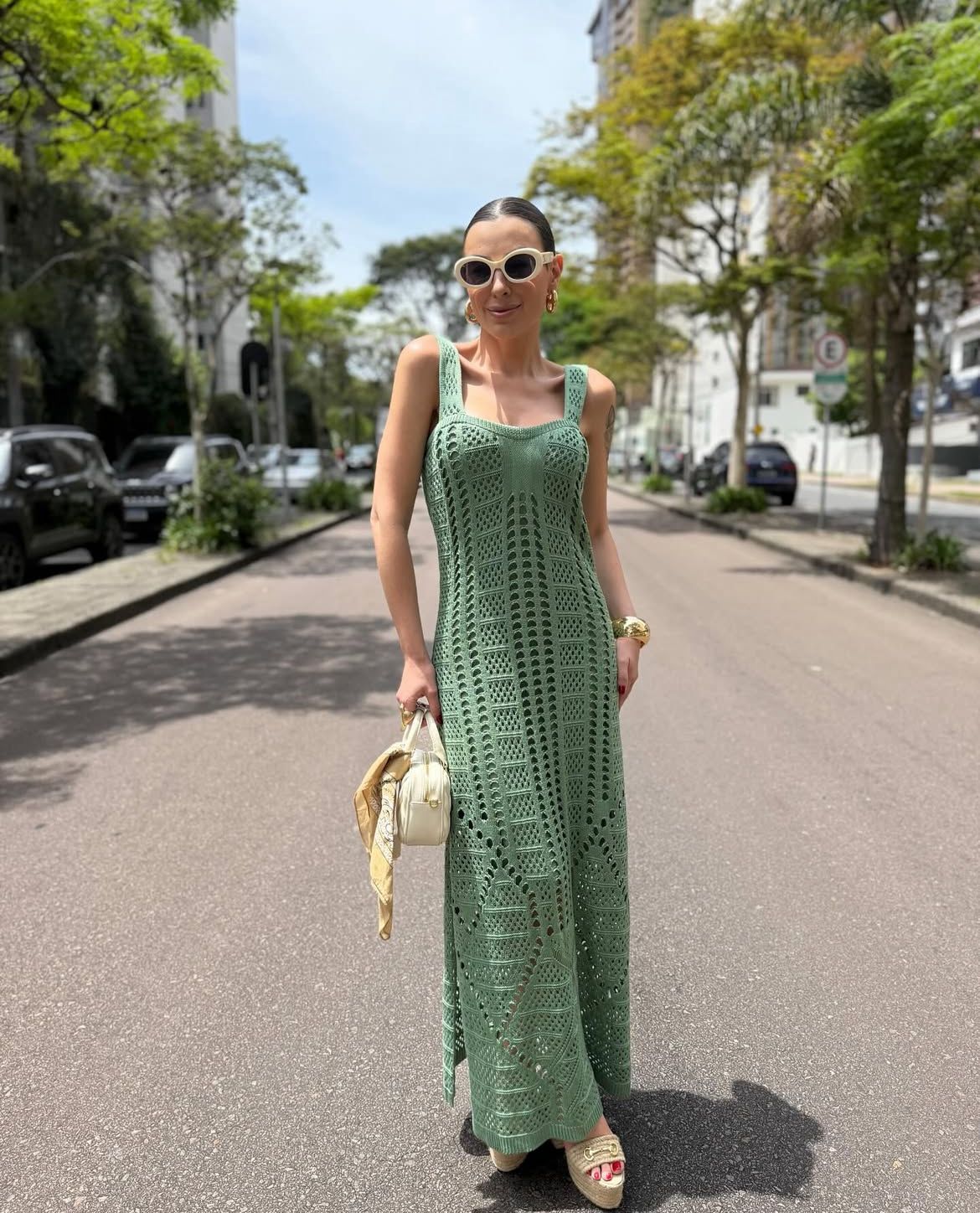 Maravilhoso vestido midi de alças mais lardas em tricot modal todo trabalhado no ponto de crochê.